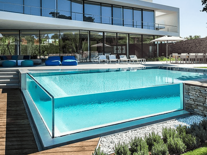 - Piscina de vidro Outra aplicação em que o vidro multilaminado é bastante utilizado são as piscinas com visores de vidro. Deve ser calculada a metragem cúbica da piscina para produzir o vidro ideal nestes projetos.